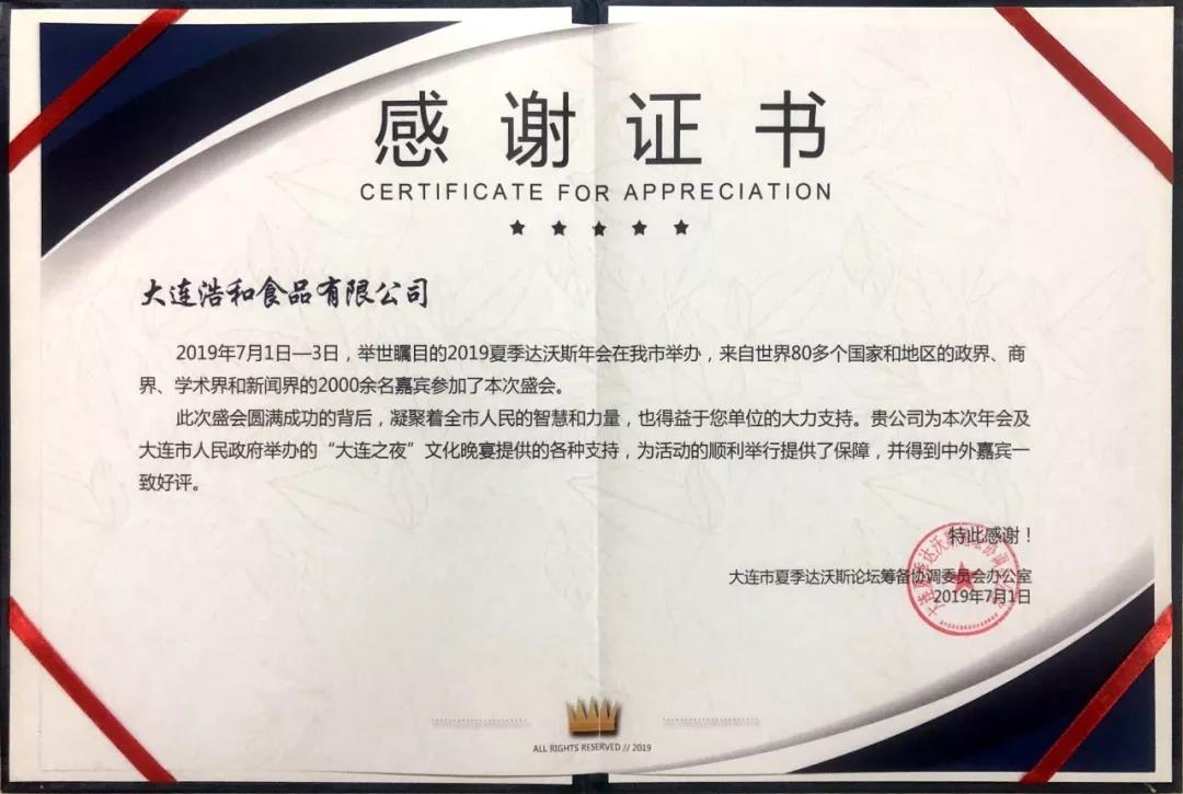 7月1日當晚,大連夏季達沃斯籌備協調委員會向所有為保障此次文化晚宴順利圓滿進行而辛苦付出和認真籌備的餐飲企業及贊助企業表示衷心的感謝,并向相關企業頒發感謝證書,浩和作為此次達沃斯文化晚宴的優秀服務商和供應商,應邀上臺領獎。